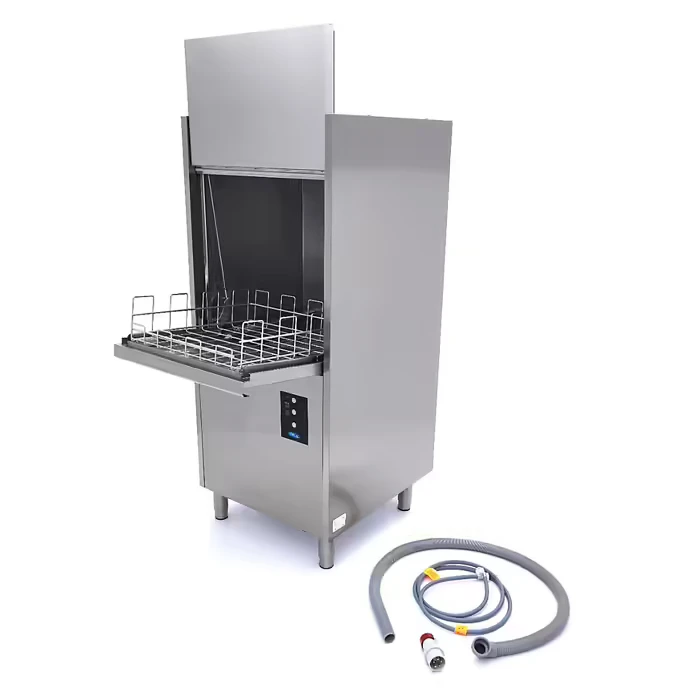 Med en nettovægt på 130 kg og en kraftig 400V / 3-faset tilslutning er denne grovopvaskemaskine bygget til at modstå de hårdeste krav i et professionelt miljø. Dens dimensioner, B72 × D80 x H170cm (lukket) og H200cm (åben), gør den egnet til de fleste storkøkkener. Bemærk venligst, at maskinen leveres eksklusive afløbs-, skyllemiddel- og sæbepumper, hvilket giver dig fleksibilitet til at vælge og integrere eksterne pumpesystemer, der passer bedst til dine specifikke installationsbehov. Den inkluderer dog en tilførselsslange, en afløbsslange og en robust kurv (56x63cm), så du hurtigt kan komme i gang med den effektive opvask.